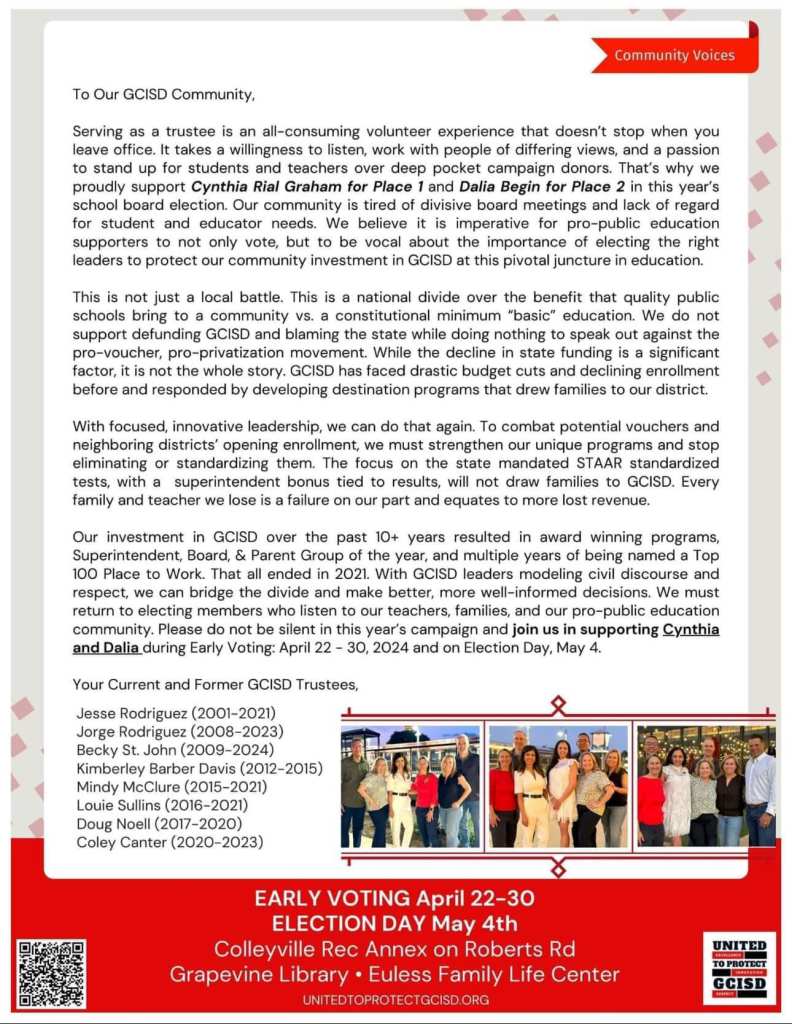 Thank you to 8 former GCISD trustees for your endorsement: